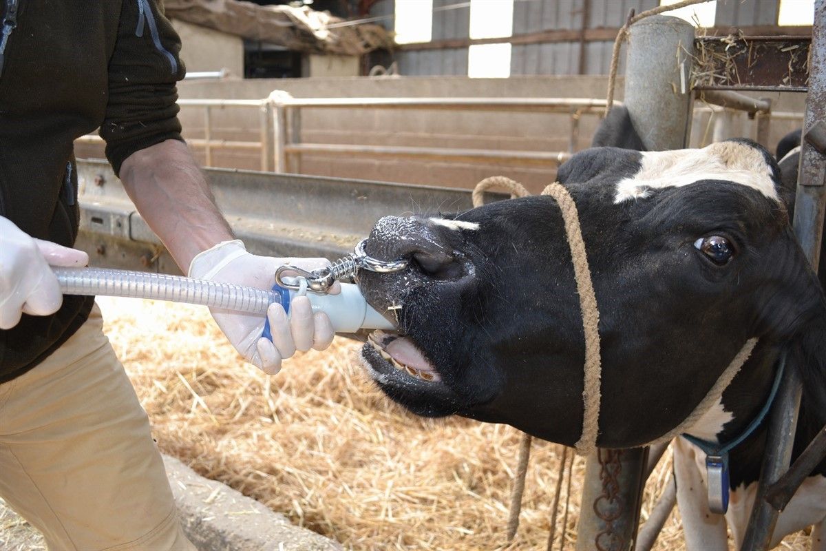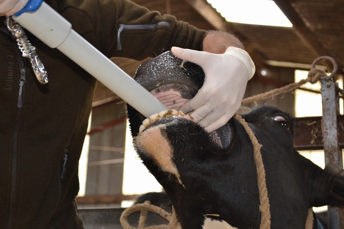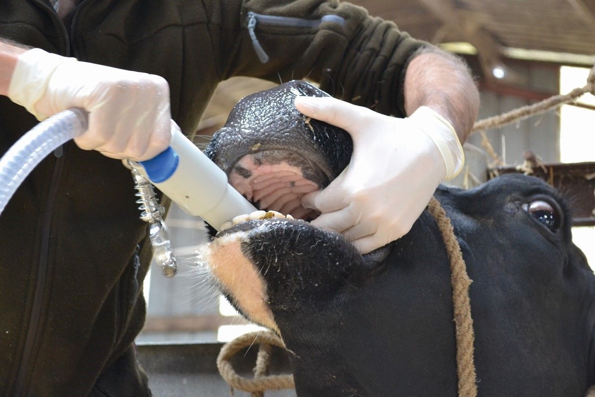 Ouvrez la bouche de la vache et insérez le tube buccal.
